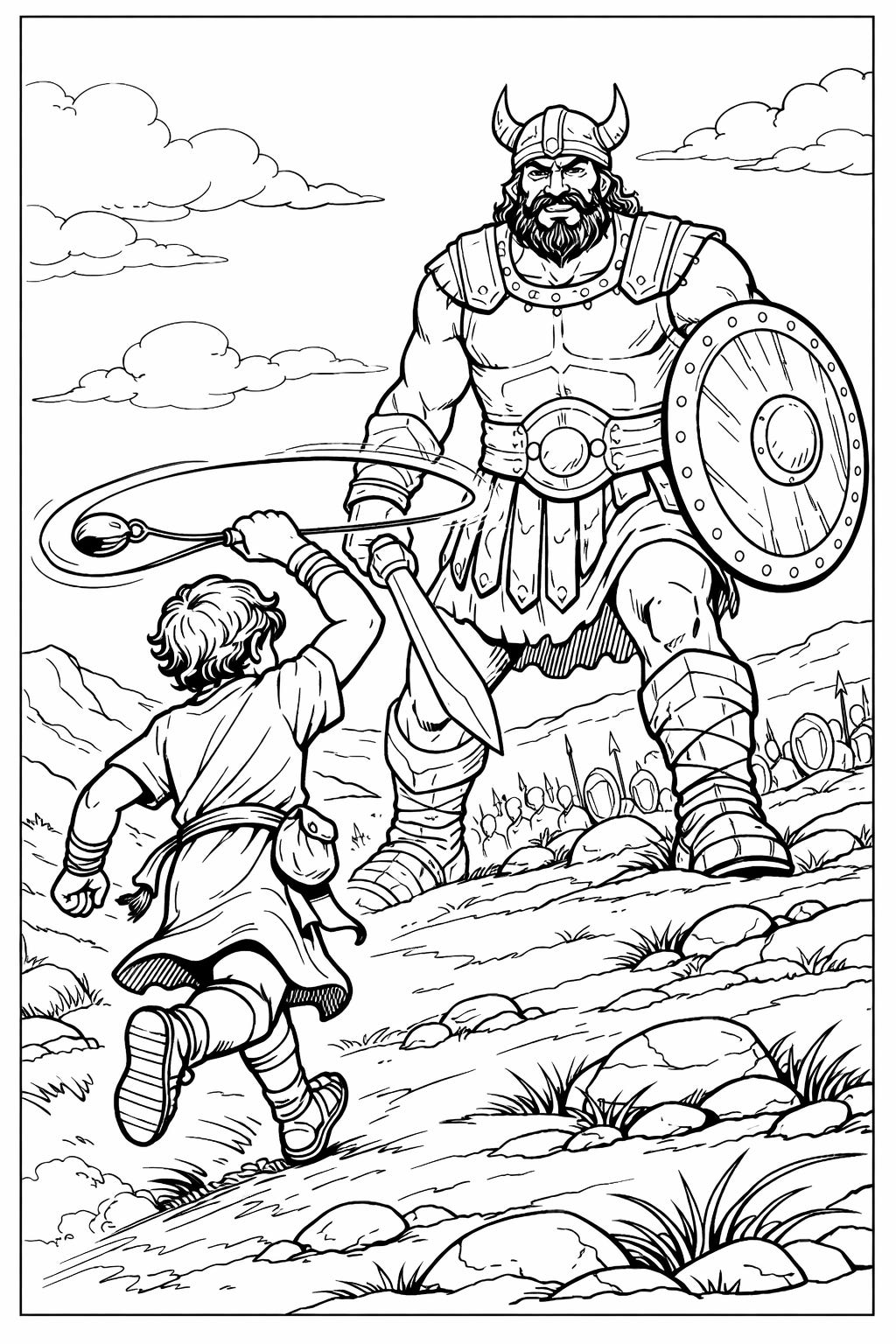 Generate a letter sized coloring page of David and Goliath where David is facing the giant and is twirling his sling over his head while running towards him.